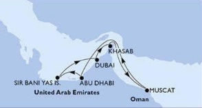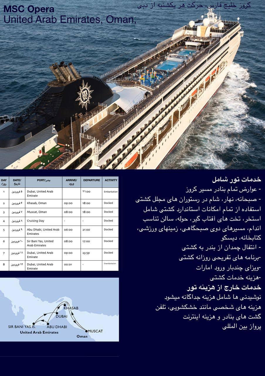 با تور کشتی کروز شرکت MSC کروز ایتالیا به عجایب و ناشناخته های سواحل جنوبی و گرم خلیج فارس سفر کنید. شهرهای دبی، خصب، ابوظبی و جزیره صیر بنی یاس کشور امارات و شهر مسقط عمان با کشتی کروز MSC Opera یک تجربه منحصربه فرد برای بازدید از زیباترین، شگفتانگیزترین، مهیجترین و شادترین شهرهای منطقه خاورمیانه، رویای سفر با کشتی کروز را برای شما جاودان و خاطره انگیز خواهد کرد. خدمات رفاهی در این کشتی کروز را در کمتر اقامتگاهی میتوانید تجربه کنید. برنامهریزی دقیق و زمانبندیهای مناسب در حرکت و میزان توقف در بنادر و شهرهای ساحلی در تور کشتی کروز MSC Opera برای بازدید از جزایر و سواحل رویایی دو کشور امارات و عمان، شبهای بیبدیل را برای عاشقان شب زنده داری رقم خواهد زد. در این تور کشتی کروز شما در بهترین فصل سال به کشورهای امارات و عمان سفر خواهید کرد و از شهرهای زیبای این کشورهای عربی دیدن خواهید کرد.